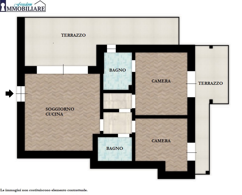 L’abitazione è composta da: ingresso, soggiorno luminoso con cucina a vista e accesso al terrazzo, disimpegno, camera matrimoniale con bagno privato finestrato, seconda camera con uscita su balcone, bagno finestrato.